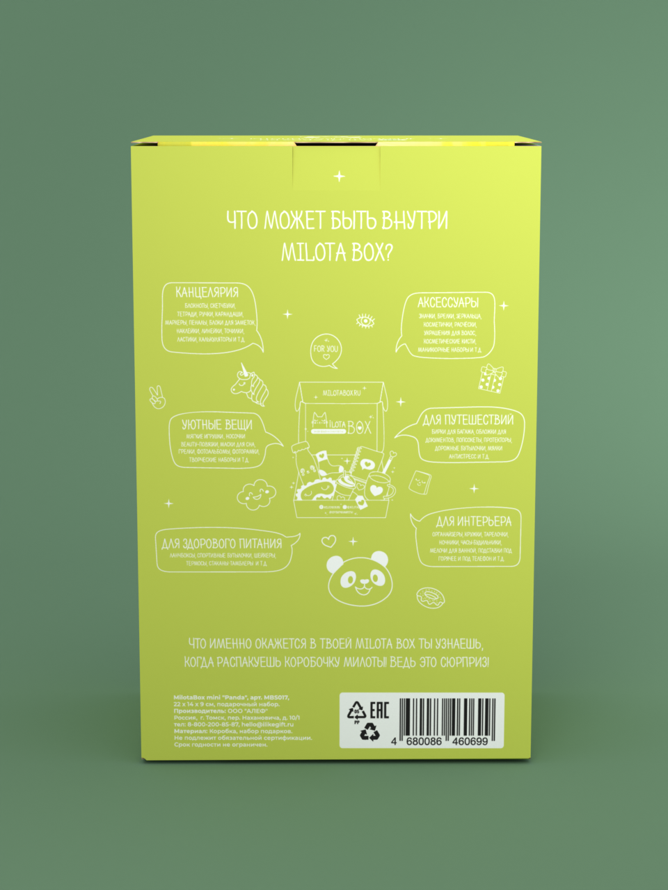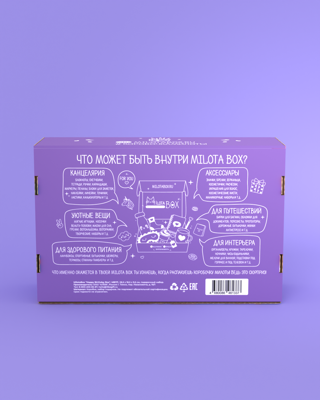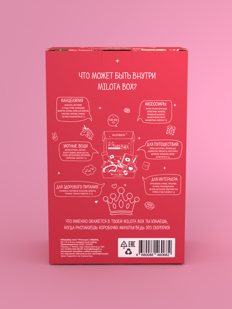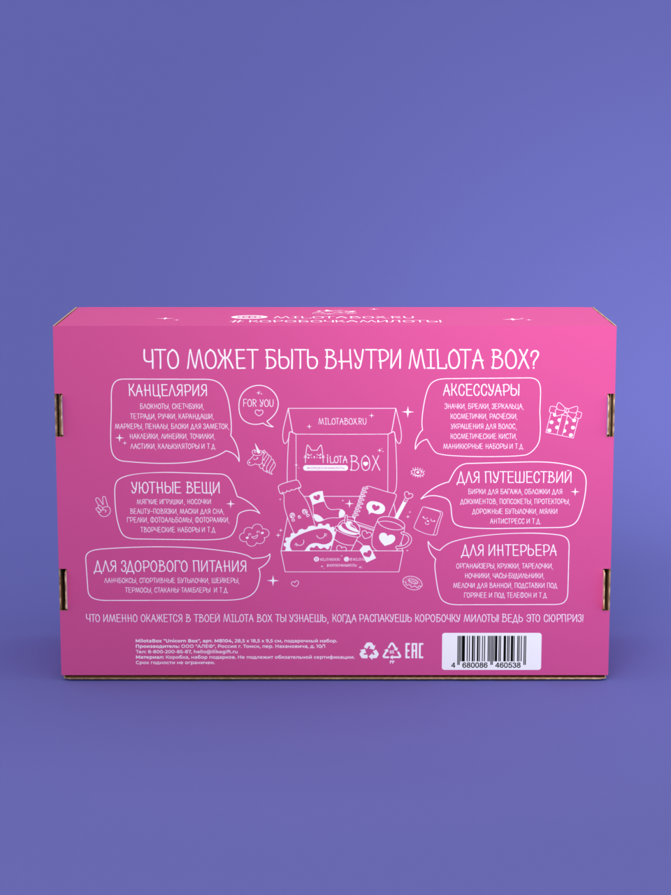 Внутри MilotaBox Big находится до 13 сюрпризов, упакованных в фирменную бумагу тишью и яркую коробочку из плотного дизайнерского картона.