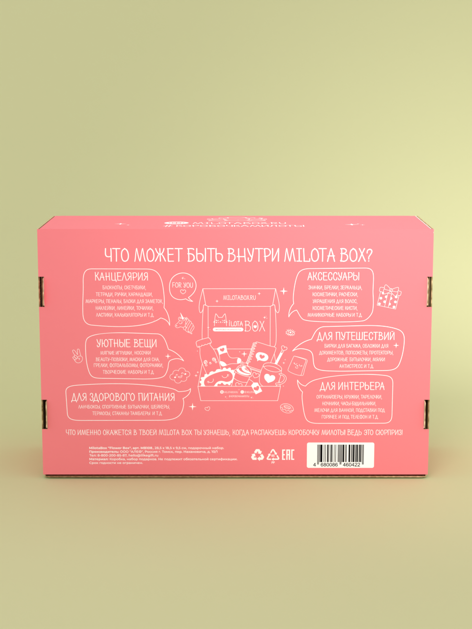Внутри MilotaBox Mini находится до 8 сюрпризов, упакованных в фирменную бумагу тишью и яркую коробочку из плотного дизайнерского картона.